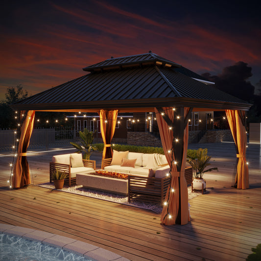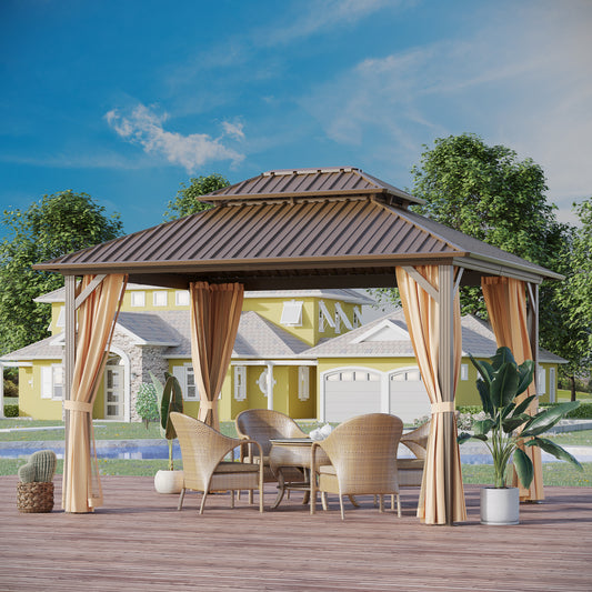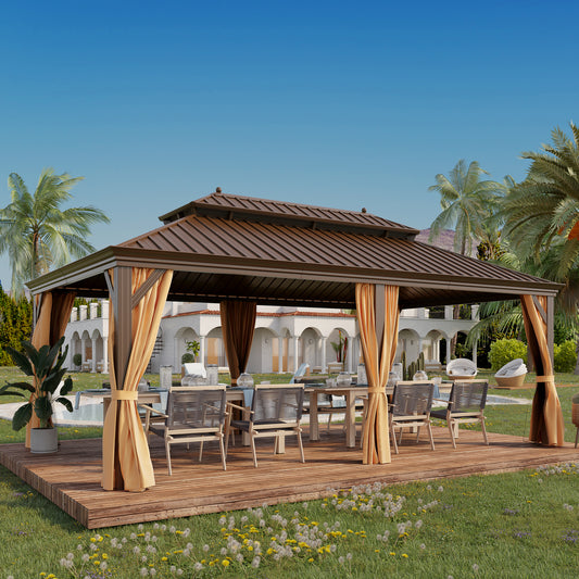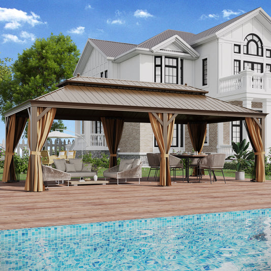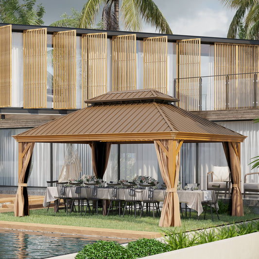 GAZEBEST 12'x16' Hardtop Gazebo Outdoor Aluminum Patio Gazebo Double Roof Galvanized Steel Gazebo Canopy Wooden Finish Coated with Netting and Curtains,for Garden Patio,Patio Backyard,Deck and Lawns
