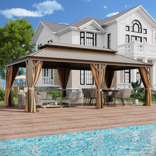 GAZEBEST 12'x20' Hardtop Gazebo Outdoor Aluminum Patio Gazebo Double Roof Galvanized Steel Gazebo Canopy Wooden Finish Coated with Netting and Curtains,for Garden Patio,Patio Backyard,Deck and Lawns
