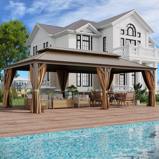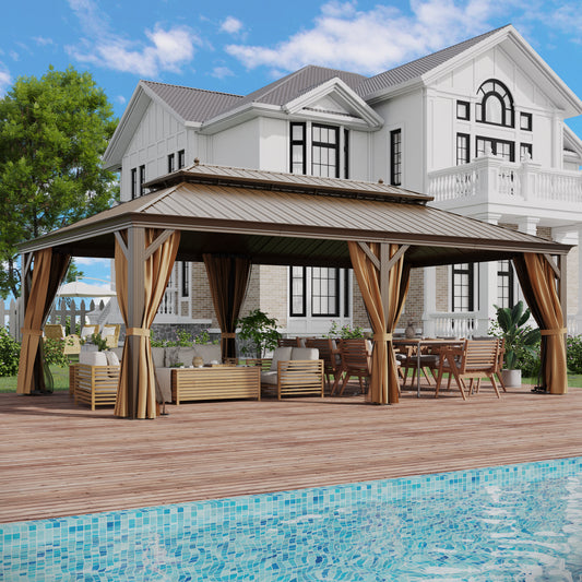 GAZEBEST 14' X 20' Permanent Hardtop Gazebo, Outdoor Galvanized Steel Double Roof Pavilion Pergola Canopy with Aluminum Frame and Privacy Curtains for Patio, Garden, Backyard, Lawn