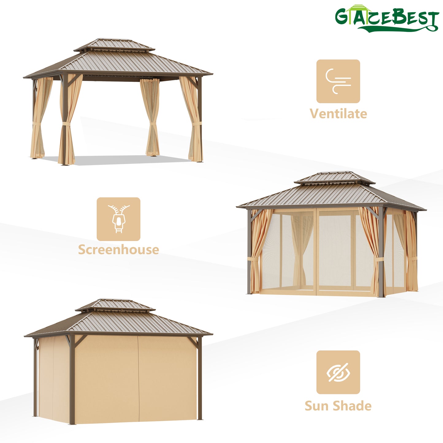 - DURABLE CURTAINS & NETTINGS - Our patio gazebo is equipped with a dual-track system that allows curtains and mosquito nets to slide independently. Thicken curtains can block UV rays and rain to create an intimate outdoor oasis for you. Mesh mosquito nets with zippers can protect you from annoying bugs and ensure good ventilation.