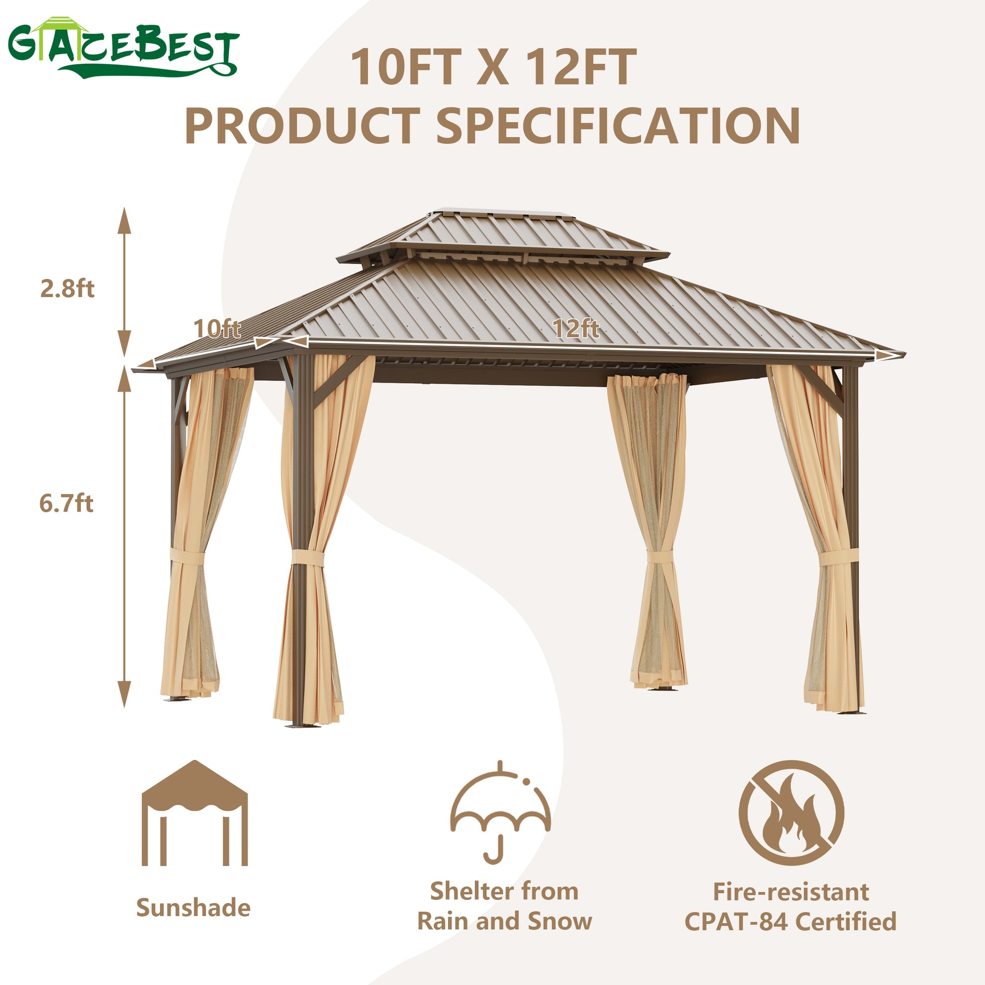 GAZEBEST 10x12 ft Hardtop Gazebo Outdoor Aluminum Patio Gazebo Double Roof Galvanized Steel Gazebo Canopy with Netting and Curtains,for Garden Patio,Patio Backyard,Deck and Lawns