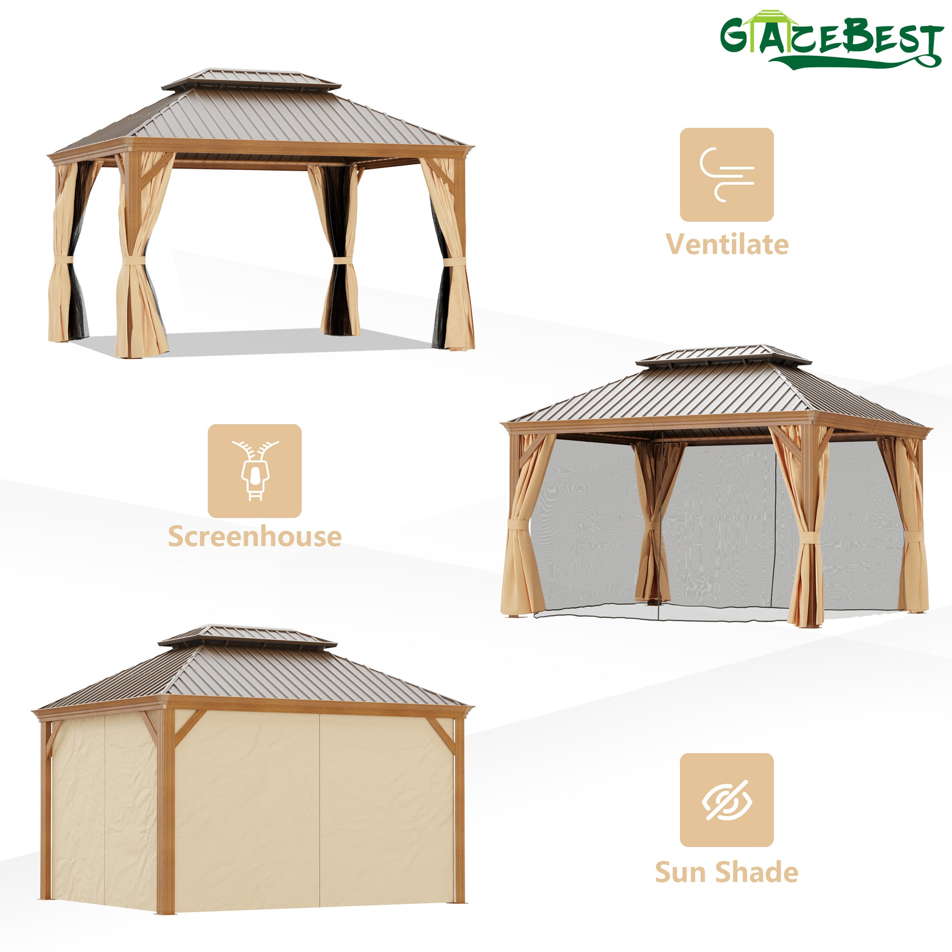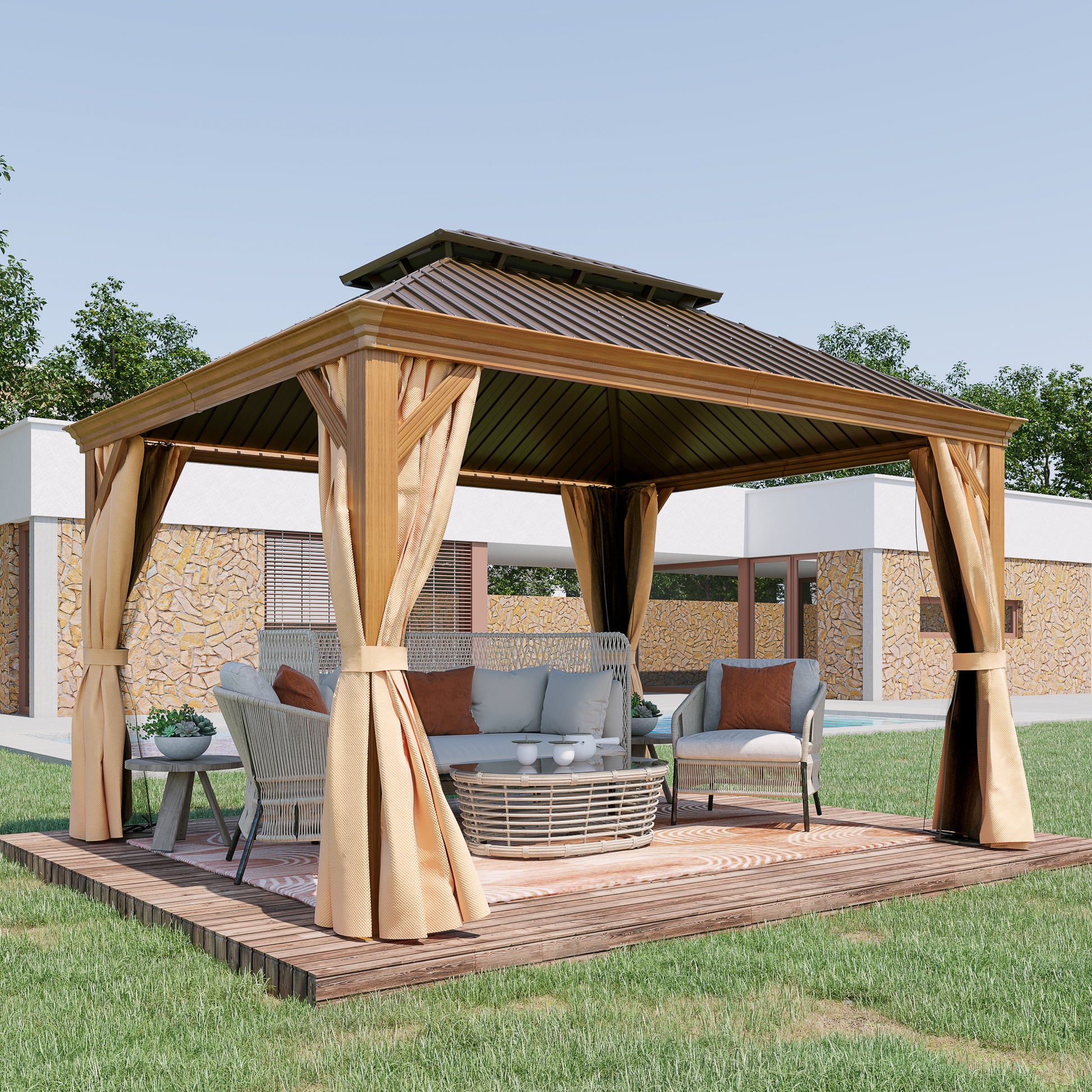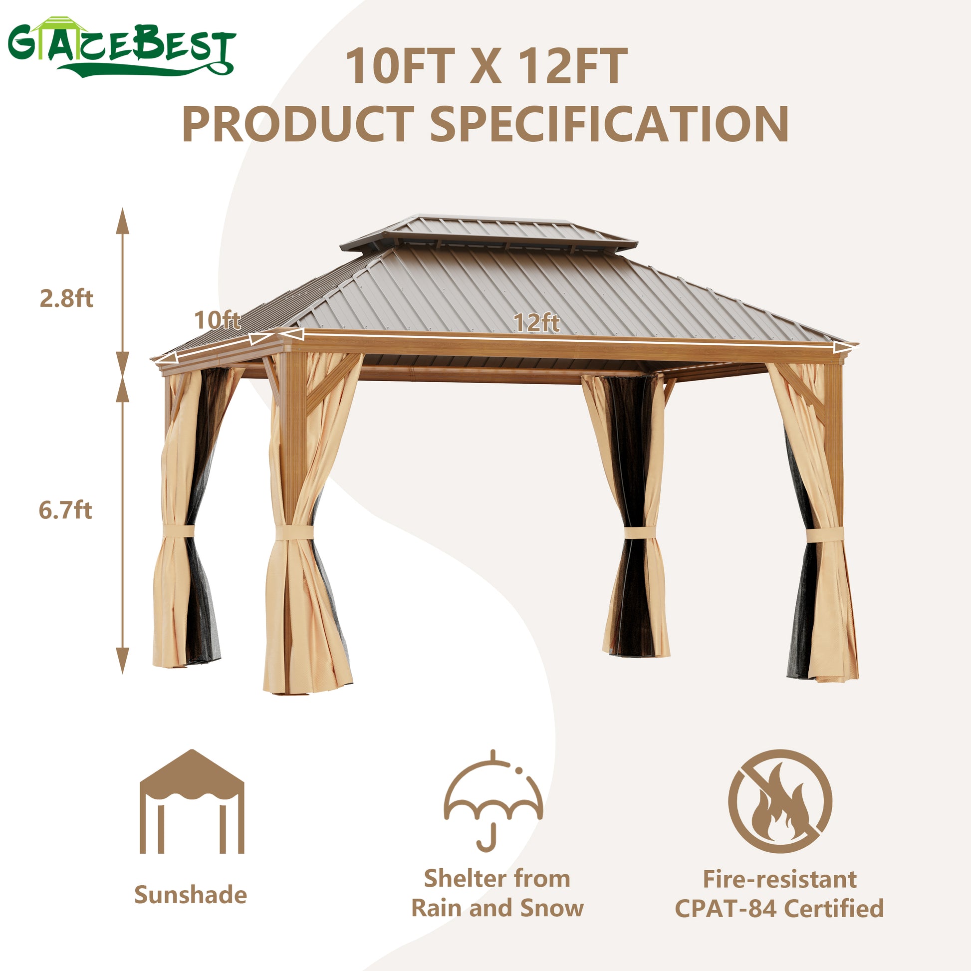 GAZEBEST 10'x12' Hardtop Gazebo Outdoor Aluminum Patio Gazebo Double Roof Galvanized Steel Gazebo Canopy Wooden Finish Coated with Netting and Curtains,for Garden Patio,Patio Backyard,Deck and Lawns