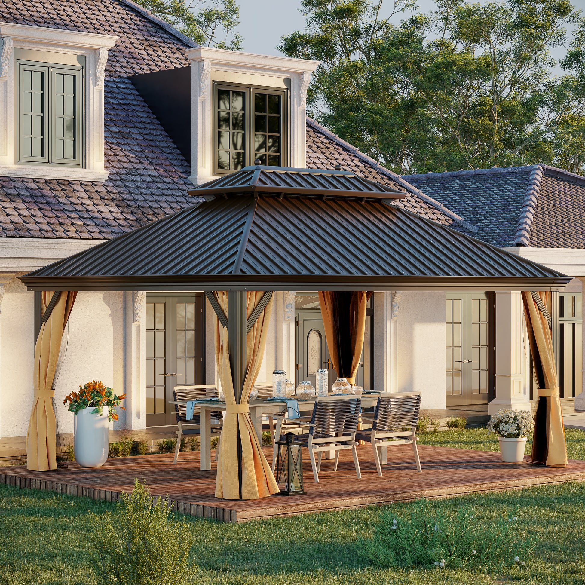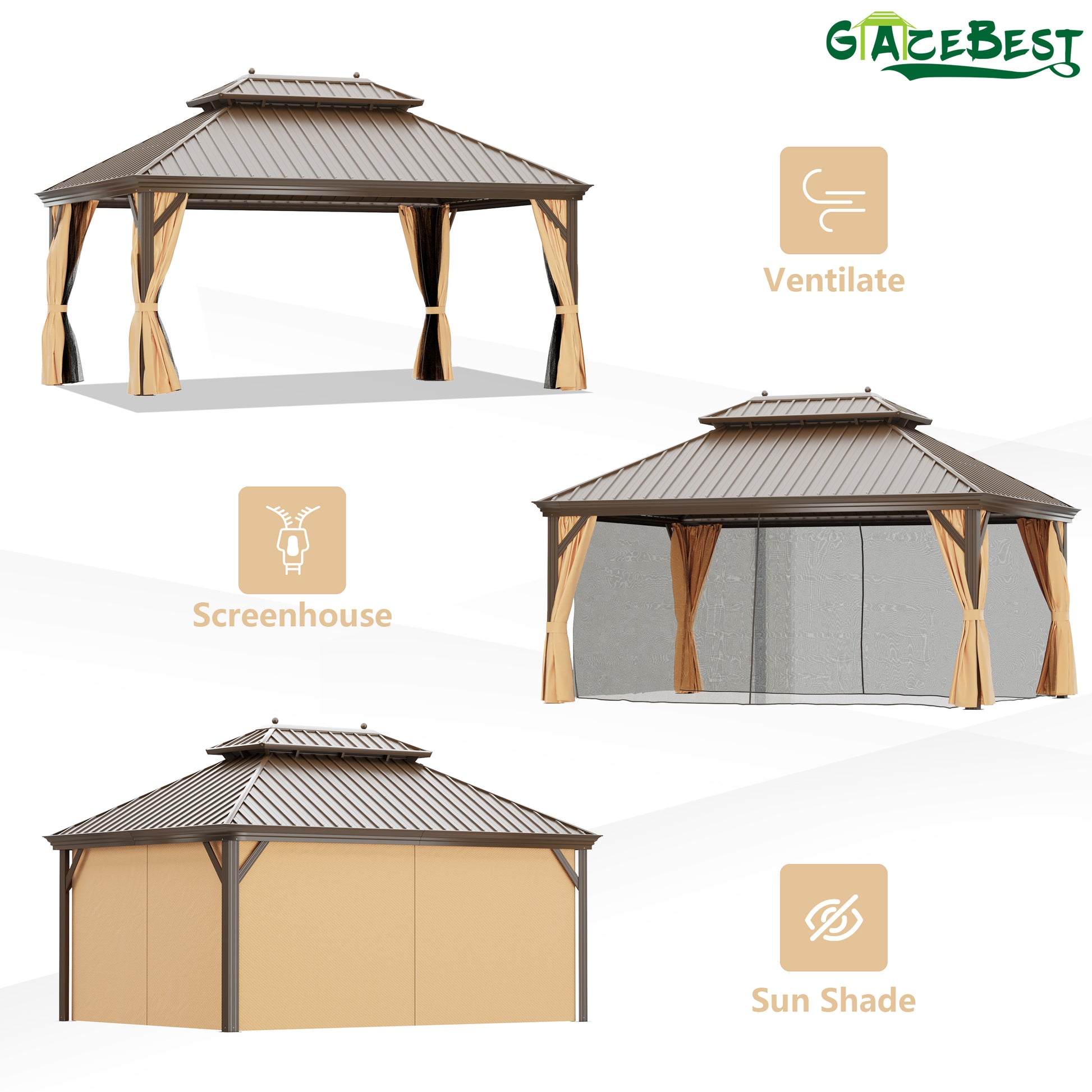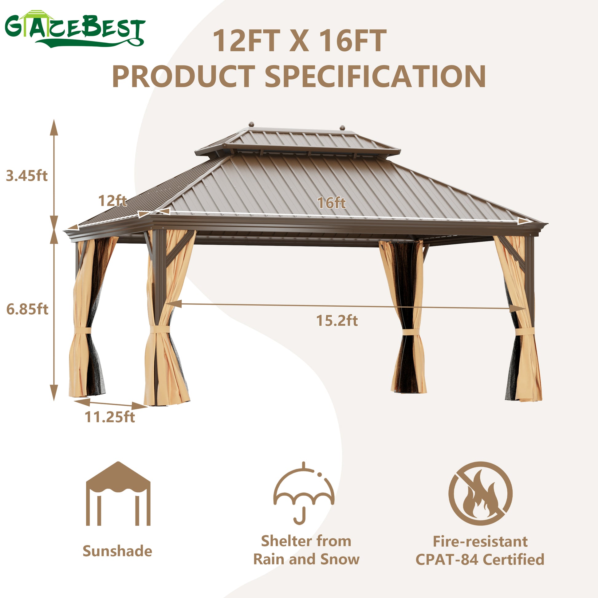 GAZEBEST 12'x16' Hardtop Gazebo Outdoor Aluminum Patio Gazebo Double Roof Galvanized Steel Gazebo Canopy with Netting and Curtains,for Garden Patio,Patio Backyard,Deck and Lawns