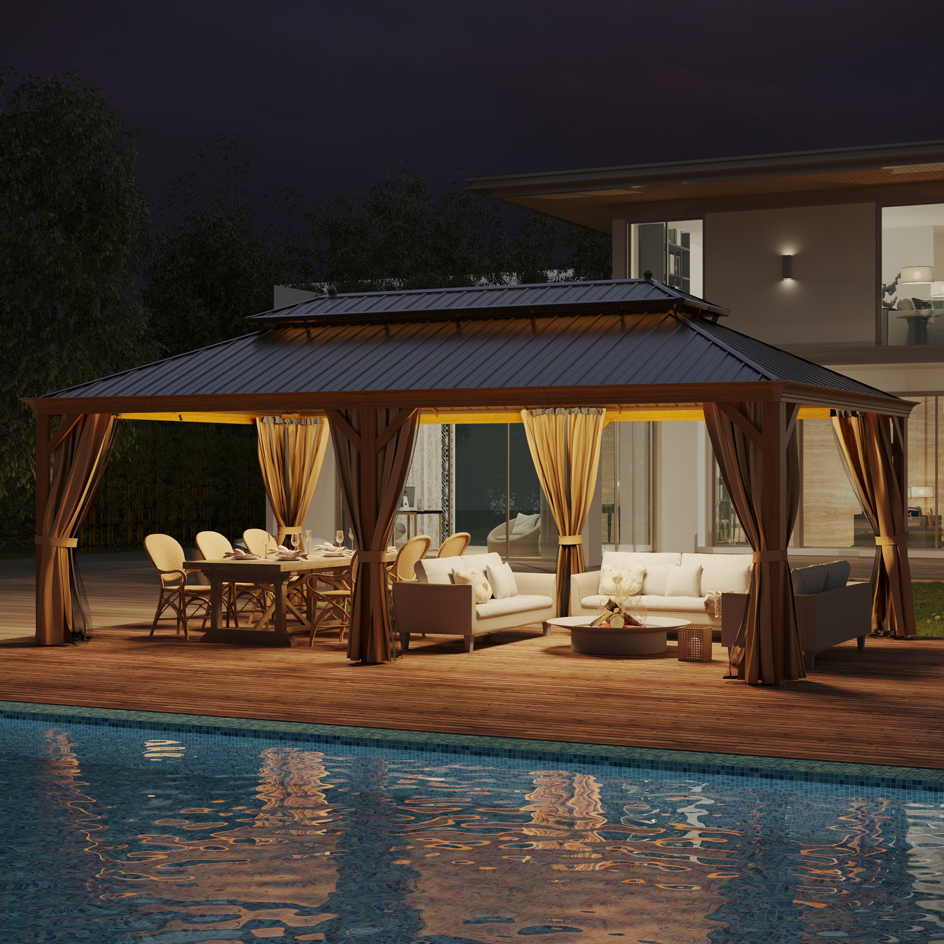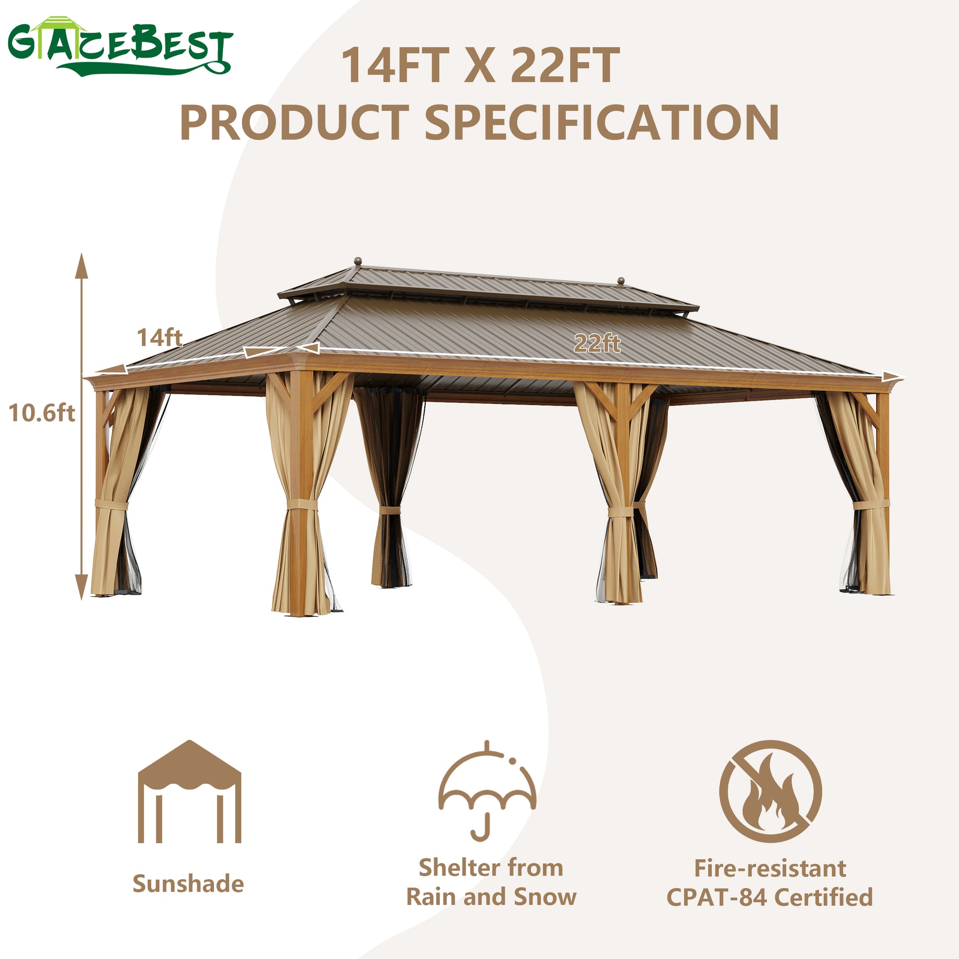 GAZEBEST 14' X 22' Permanent Hardtop Gazebo, Outdoor Galvanized Steel Double Roof Pavilion Pergola Canopy Wood-Looking with Aluminum Frame and Privacy Curtains for Garden,Patio