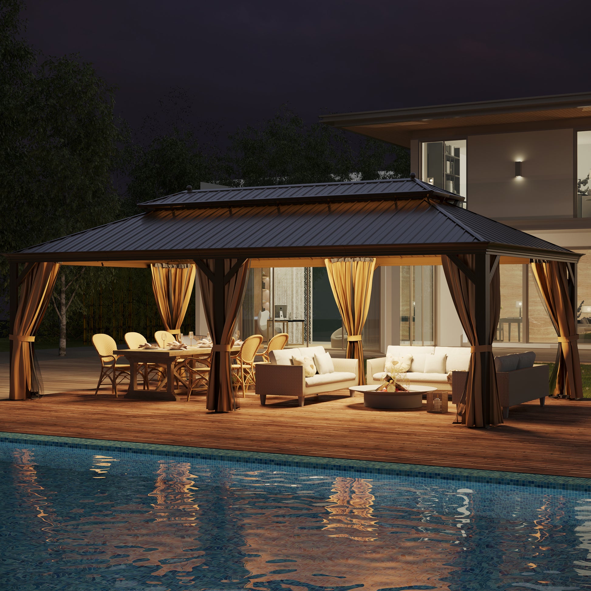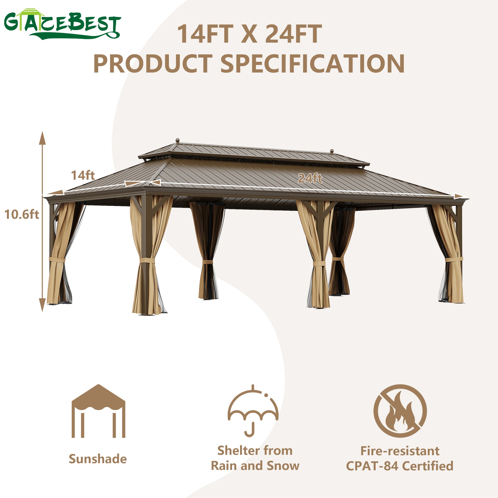 GAZEBEST 14' X 24' Permanent Hardtop Gazebo, Outdoor Galvanized Steel Double Roof Pavilion Pergola Canopy with Aluminum Frame and Privacy Curtains for Garden Patio,Patio Backyard,Deck and Lawns